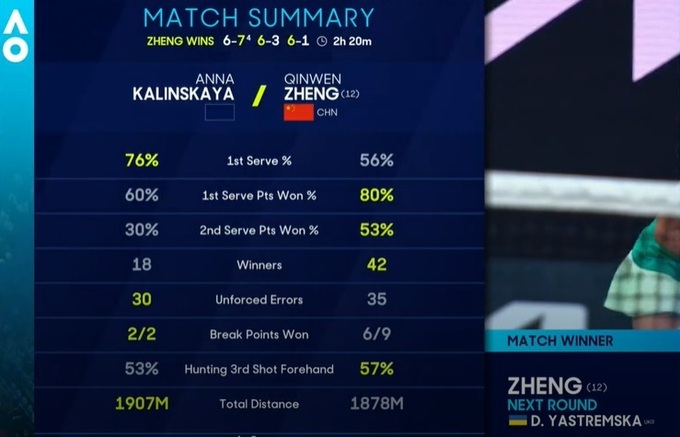 12-я сеяная китаянка Чжэн Циньвень обыграла «нейтральную» теннисистку Анну Калинскую в 1/4 финала Открытого чемпионата Австралии по теннису и в полуфинале сразится против украинки Даяны Ястремской.