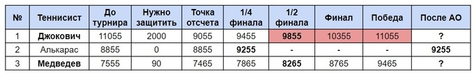 Новак гарантировал себе 9855 очков после завершения турнира, у Карлоса будет 9255, Даниил в случает выигрыша титула наберет 9465 очков и станет второй ракеткой мира.