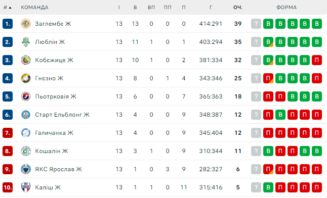 Галичанка занимает 7-е место среди 10 команд, имея 12 очков (4 победы и 9 поражений).