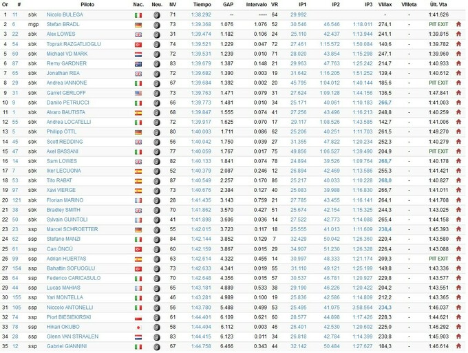 Шестикратный чемпион мира Джонатан Рей, который в этом сезоне будет выступать за заводскую команду Ямаха, показал седьмое время - 1:39.682. Действующий вице-чемпион мира Топрак Разатлыолу, который также сменил команду Ямаха на BMW, стал четвертым. А в первую тройку вошли, помимо Булеги, тест-райдер программы Хонда MotoGP Штефан Брадль и лидер Кавасаки Алекс Лоуз.