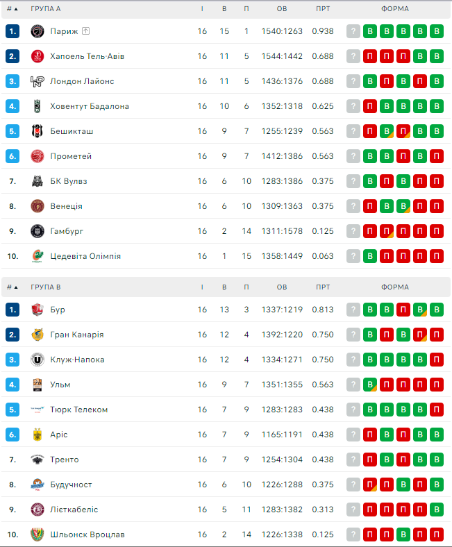 «Прометей», у которого 9 побед и 7 поражений, точно не опустится ниже 6-го места по итогам регулярного чемпионата Еврокубка. Украинская команда гарантированно примет участие в плей-офф, куда выходит по 6 команд из каждой группы.