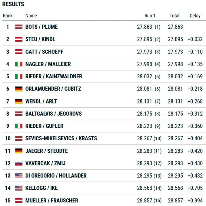По итогам соревнований латыши опередили ближайших соперников, титулованных австрийцев Томаса Штоя и Вольфганга Киндля на 0.032 секунды. Замкнули призовую тройку еще одни австрийские саночники Юри Гатт и Рикардо Шепф, а звездные немецкие Тобиасы Вендль и Арльт допустили ошибку и в итоге финишировали с седьмым временем.