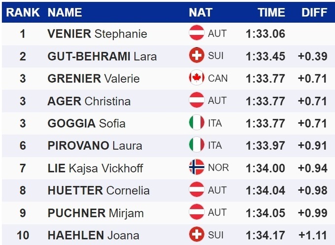 Австрийка опередила швейцарку Лару Гут-Бехрами, третье место разделили сразу три спортсменки: канадка Валери Гренье, австрийка Кристина Агер и итальянка Софья Годжа.
