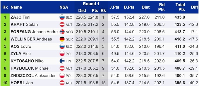Лидирует на середине дистанции словенец Тими Зайц, который опережает австрийца Штефана Крафта и норвежца Йоханна Андре Форфанга.