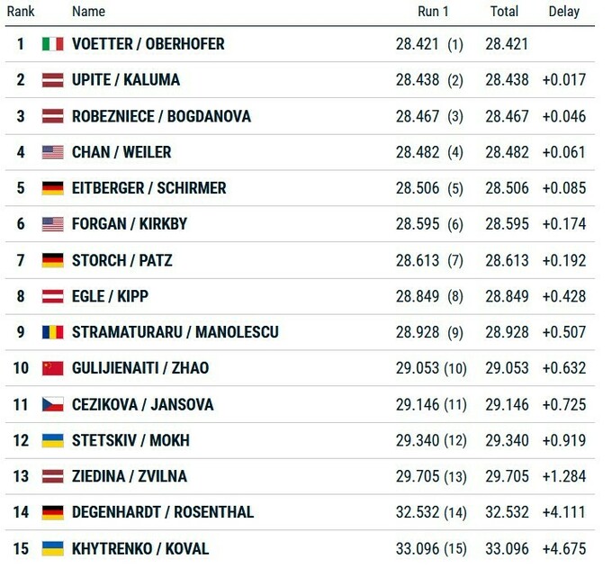 Для итальянок это первый титул чемпионок мира в карьере. Второе место заняли латышки Анда Упите и Зане Калума, которые проиграли Феттер и Оберхофер 0.017 секунды. Замкнули призовую тройку еще одни саночницы из Латвии Марта Робежниеце и Кития Богданова.