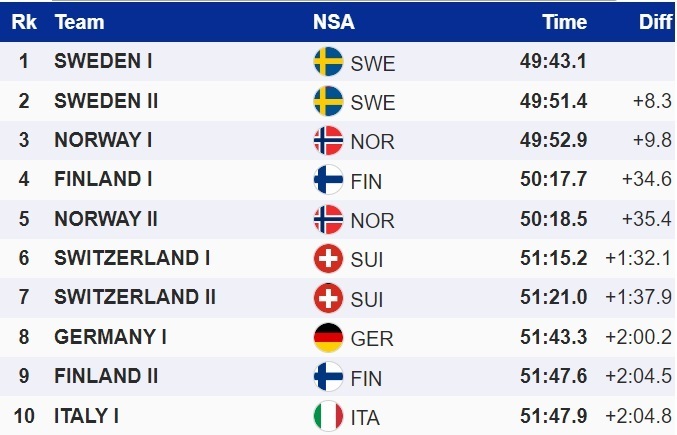 Они опередили второй состав сборной Швеции (Йохан Хагстрём, Эбба Андерссон, Эдвин Ангер, Майя Дальквист) и первый состав сборной Норвегии (Мартин Лёвстрём Ньенгет, Маргрете Бергане, Симен Хегстад Крюгер, Тириль Венг).