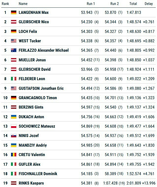 Для 24-летнего Лангенхана это первый титул чемпиона мира в карьере. Немец выиграл оба спуска и опередил австрийца Нико Гляйршера, который стал вторым, на 0.761 секунды. Третье место занял еще один немецкий саночник, титулованный Феликс Лох, который проиграл соотечественнику 0.817 секунды.