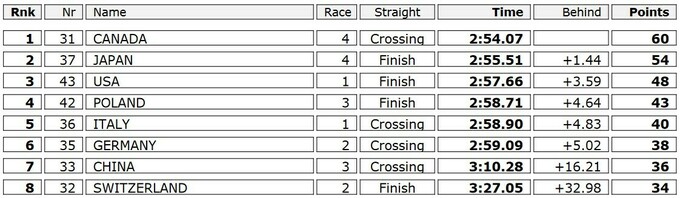 Не сбило канадок с чемпионского темпа и небольшое спотыкание Вейдманн за круг до финиша. В итоге они опередили японок Юну Онодеру, Аяно Сато и Момоку Хорикаву, которые стали вторыми, на 1.44 секунды. Замкнули призовую тройку местные спортсменки Миа Манжанелло, Бриттани Боу и Джорджия Биркеланд.