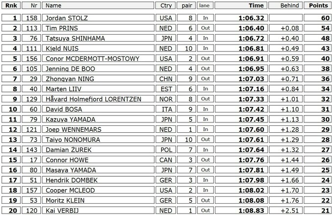 Для Столца эта победа стала четвертой на американском этапе Кубка мира. Напомним, что в первой гонке на 1000 метров в пятницу, 26 января, американец установил мировой рекорд. Второе место сегодня занял молодой нидерландец Тим Принс, для которого это первый в карьере подиум в Дивизионе А Кубка мира. Столцу Принс проиграл всего 0.08 секунды. Замкнул призовую тройку японский спортсмен Тацуя Синхама.