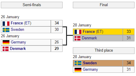 28 января состоялись решающие матчи. В поединке за золотые медали Франция обыграла Данию в овертайме (33:31 OT).