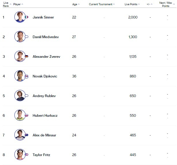 В Чемпионской гонке лидирует чемпион Aus Open Янник Синнер.