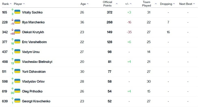 Что касается украинцев, то Виталий Сачко поднялся на три позиции, Илья Марченко потерял 11 мест, а Алексей Крутых – 45.