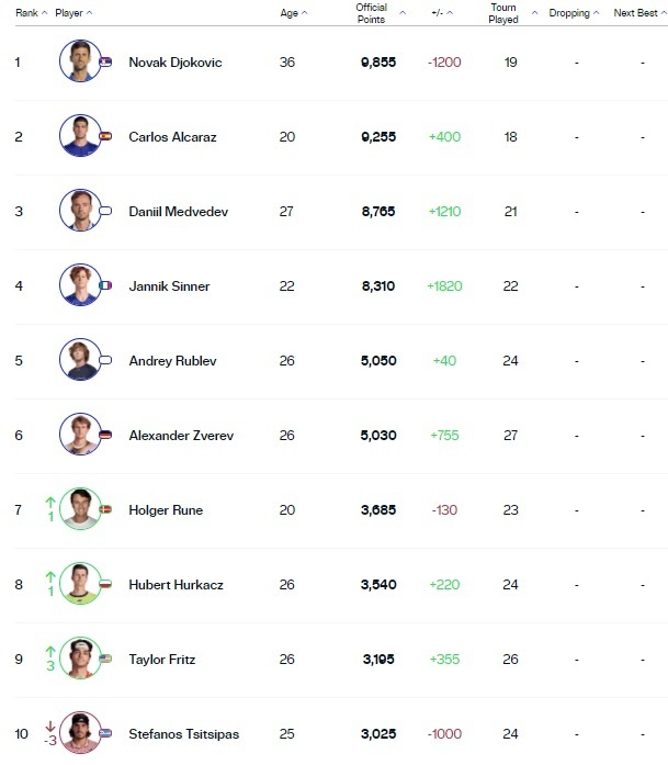 Новак Джокович не смог защитить титул, но Карлос Алькарас не смог воспользоваться этим шансом и остался на второй позиции. Даниил Медведев сократил отставание от лидеров, также намного ближе к ним подтянулся победитель австралийского мейджора Янник Синнер.