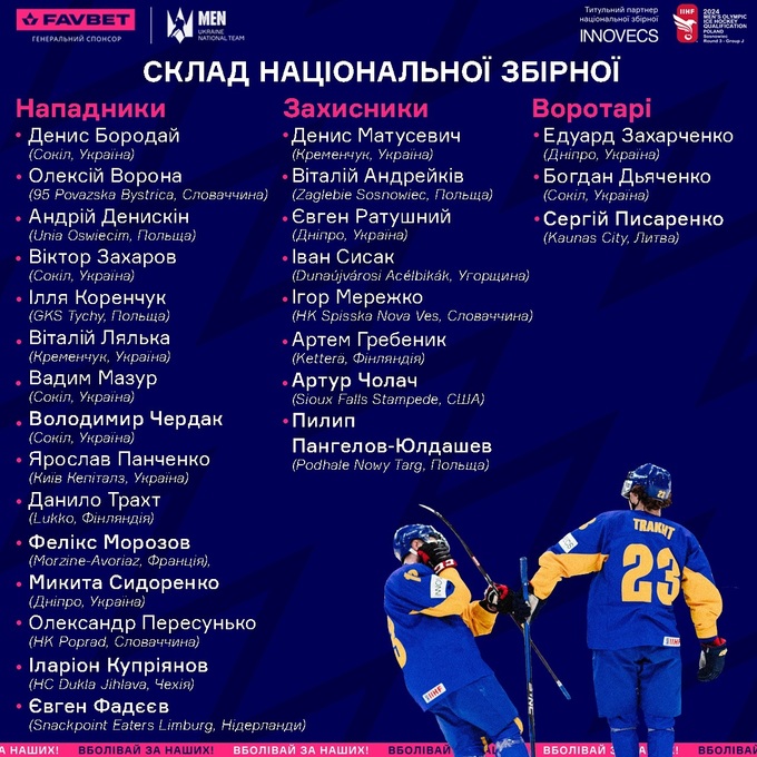 Форварды: Бородай (Сокол), Ворона (Поважска-Бистрица, Словакия), Денискин (Уния, Польша), Захаров (Сокол), Коренчук (Тыхы, Польша), Лялька (Кременчуг), Мазур (Сокол), Чердак (Сокол), Панченко (Киев Кэпиталз), Трахт (Лукко, Финляндия), Морозов (Морзин, Франция), Сидоренко (Днепр), Пересунько (Попрад, Словакия), Куприянов (Дукла, Чехия), Фадеев (Лимбург, Нидерланды).