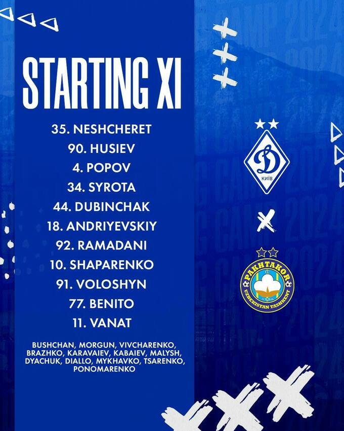 Стартовый состав «Динамо»: Нещерет, Гусев, Попов, Сирота, Дубинчак, Андриевский, Рамадани, Волошин, Шапаренко, Бенито, Ванат.