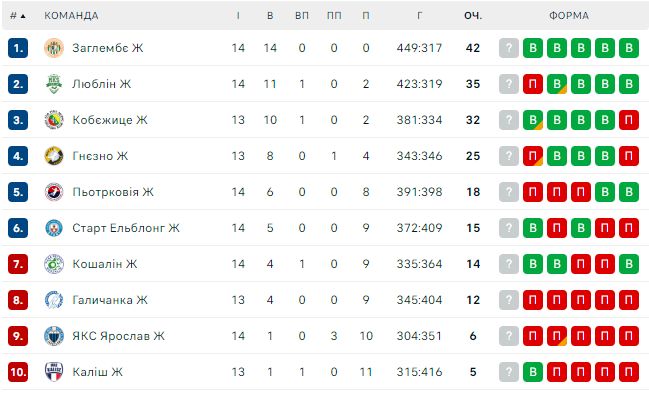 Галичанка занимает 8-е место среди 10 команд, имея 12 очков (4 победы и 9 поражений).