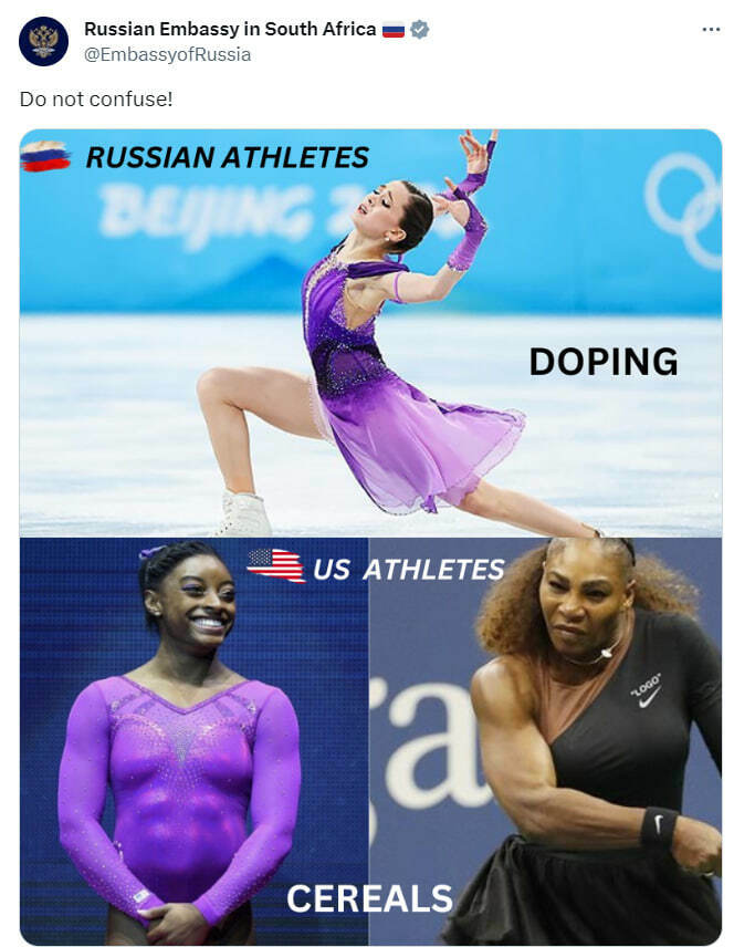 Официальный Twitter-аккаунт посольства россии в Южной Африке (ЮАР) опубликовало расистский пост, затронув легендарную 42-летнюю американскую теннисистку Серену Уильямс, на счету которой 23 титула на турнирах Grand Slam в одиночном разряде и золотая медаль Олимпиады в Лондоне в 2012 году, а также гимнастку Симону Байлз – четырёхкратную олимпийскую чемпионку 2016 года и 21-кратную чемпионку мира.