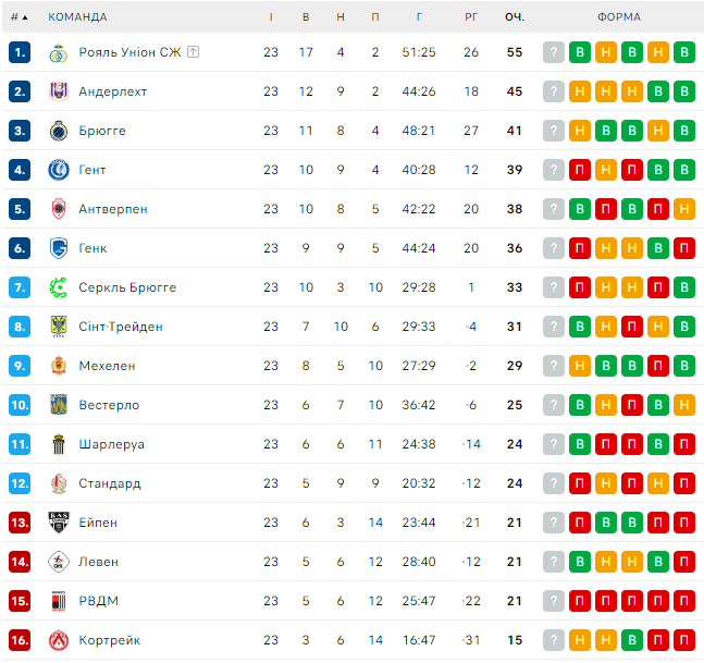 Лидеры: Сен-Жилуаз (55), Андерлехт (45), Брюгге (41), Гент (39), Антверпен (38), Генк (36).