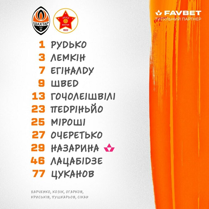 Состав «Шахтера» на матч с «Вележем»: Рудько, Гочолеишвили, Лемкин, Лацабидзе, Педриньо, Мироши, Назарина, Очеретько, Швед, Цуканов, Эгиналду.