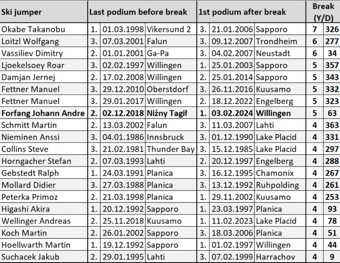 Сказать, что победа была для Форфанга долгожданной – не сказать ничего: достаточно было посмотреть на его слезы радости после завершения соревнований. Это был его четвертый в карьере успех на Кубке мира, и предыдущий датирован еще 1 декабря 2018 года – более 5 лет ожидания. На следующий день после последней победы, 2 декабря 2018 года в том же нижнем тагиле Форфанг стал вторым, и то был его последний подиум на Кубке мира до вечера прошлой субботы. Это восьмой самый большой временной разрыв между двумя соседними попаданиями на подиум прыгуна в истории Кубка мира: