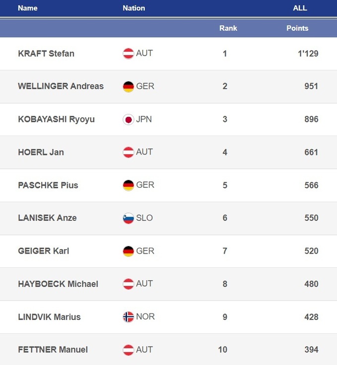 Ну а победа в воскресном личном турнире досталась хозяевам, если точнее – Андреасу Веллингеру. Судьба вернула немцу должок за субботу, когда ему в обеих попытках не везло с ветровыми условиями, и принесла вторую победу в сезоне. Что интересно, в обеих случаях Веллингер после первой попытки занимал седьмое место, но в субботу он с него улетел на 17-ю позицию, а в воскресенье – прорвался ко второй в сезоне (и второй домашней) победе.