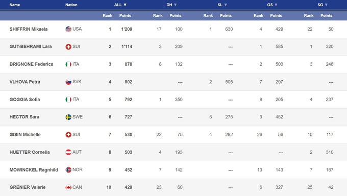 Снова заехала в топ-10 в гиганте Зринка Лютич. Хорватка сейчас в отличной форме, и травмы Шиффрин с Влховой открывают для нее дорогу к возможной первой в карьере победе на Кубке мира. Продолжает показывать отличные результаты Камиль Раст – у нее пятое подряд попадание в топ-10, при чем дважды швейцарка останавливалась в шаге от подиума.