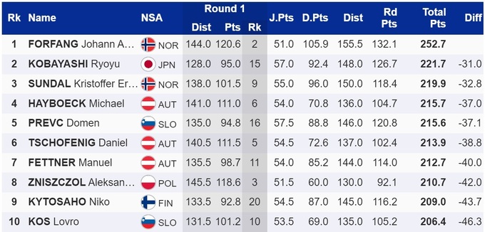 Неожиданную победу в тяжелых и переменчивых погодных условиях одержал норвежец Йоханн Андре Форфанг, который аж на 31 балл опередил японца Рёю Кобаяси. Лидер общего зачета, австриец Штефан Крафт, показал лишь 39-й результат.