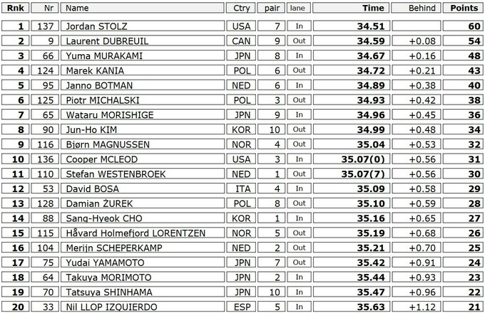 Таким образом, Столц второй раз подряд смог выиграть две гонки за один день. Второе место занял любимец местных болельщиков Лоран Дюбрей, который проиграл американцу 0.08 секунды. Замкнул первую тройку японский спортсмен Юма Мураками, который показал лучший разгон, но на финише отстал от Столца на 0.16 секунды.