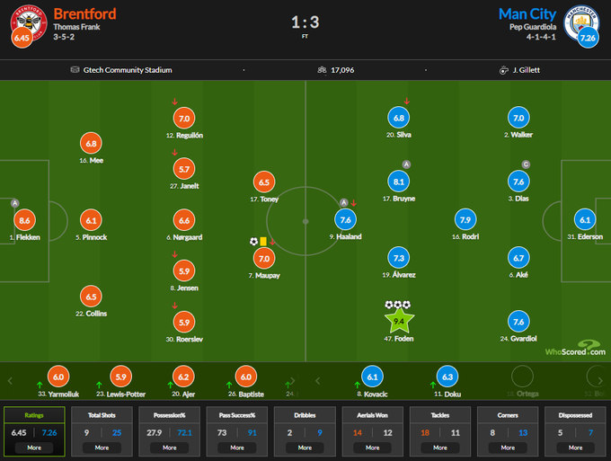 Оценки WhoScored за матч Брентфорд – Манчестер Сити – 1:3