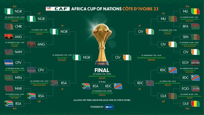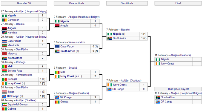 В финале сыграют сборные Кот-д'Ивуара (прозвище: Слоны) и Нигерии (Суперорлы), Финальный матч пройдет 11 февраля в Абиджане. А во встрече за третье место днем ранее встретятся сборные ЮАР и ДР Конго.