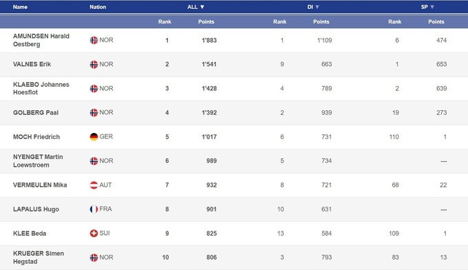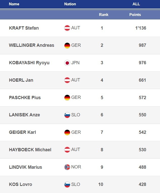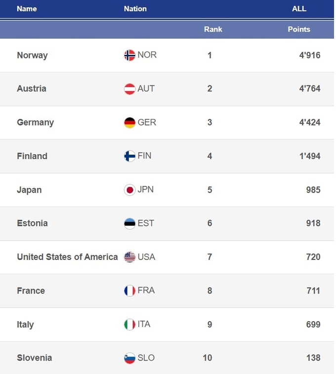 По итогам мегауспешного выступления в личных турнирах в Лейк Плесиде Кос имеет на своем счету уже 508 очков в Кубке мира – личный рекорд для словенца установлен уже сейчас. И это при том, что сезон едва перевалил за экватор, а первые четыре личных старта (этапы в Руке и Лиллехаммере) Ловро пропускал! А вот субботний парный командный турнир (SuperTeam) Кос по своим меркам провалил, что привело к тому, что сборная Словении заняла скромное шестое место. Партнером Коса по дуэту был Домен Превц: Тими Зайц этап в Лейк Плесиде провалил, набрав суммарно лишь 11 очков за два дня (39-е и 20-е места), хотя, стоит отметить, что ему с ветром как раз не везло, особенно в субботу.