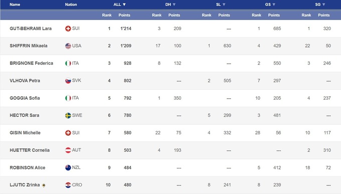 Так или иначе, по итогам субботнего гиганта Шиффрин потерла лидерство в общем зачете Кубка мира. Очередную победу одержала Лара Гут-Бехрами, которая прорвалась с девятого места после первой попытки, и теперь опережает американку на 5 очков в генеральной классификации.