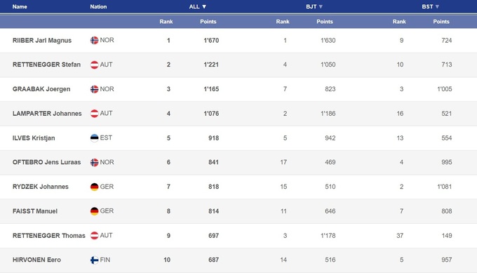 В первые два дня компанию Рииберу и Ильвесу на подиуме составлял Йоханнес Лампартер, а вот в воскресенье он провалился: лишь седьмое место на трамплине и слабая гонка, по итогам которой он опустился на 13-ю позицию. Впрочем, без подиума в воскресенье Австрия не осталась – вторым стал Штефан Реттенэггер.