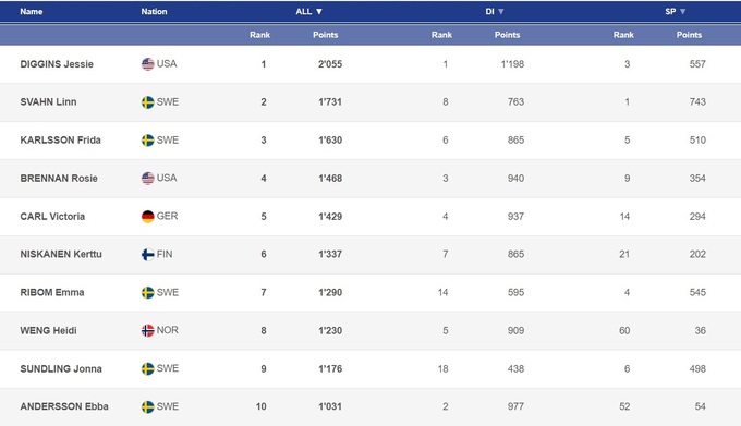 Джессика Диггинс уверенно выиграл пятничный коньковый масс-старт, а в воскресном классическом замкнула топ-10. В субботнем же спринте американка действовала в уже привычной для нынешнего сезона манере: максимально выложиться на предварительных стадиях плей-офф, главное – добраться до финала, а там – будь что будет. Безусловно, такая тактика вполне оправдана с точки зрения защиты лидерства в общем зачете, но, думаю, запас класса в коньковом спринте у Диггинс достаточный для того, чтобы не довольствоваться просто попаданием в финал любой ценой: можно действовать на первых стадиях плей-офф и более экономно.