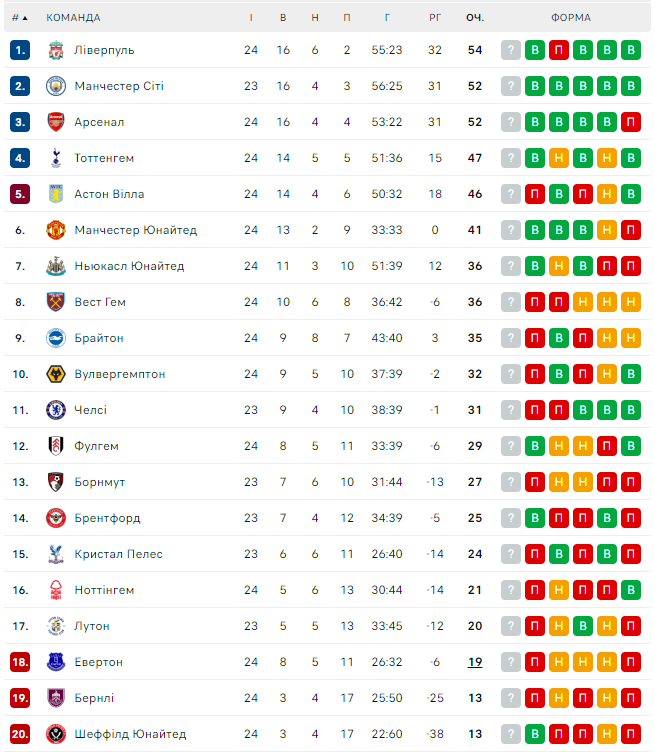 Лидеры АПЛ: Ливерпуль (54), Ман Сити, Арсенал (по 52), Тоттенхэм (47), Астон Вилла (46), Ман Юнайтед (41).