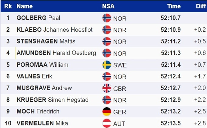 Топ-3 замкнул еще один представитель Норвегии, Маттис Стенсхаген. Лидер Кубка мира, Харальд Остберг Амундсен, финишировал четвертым.
