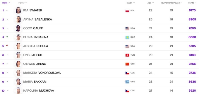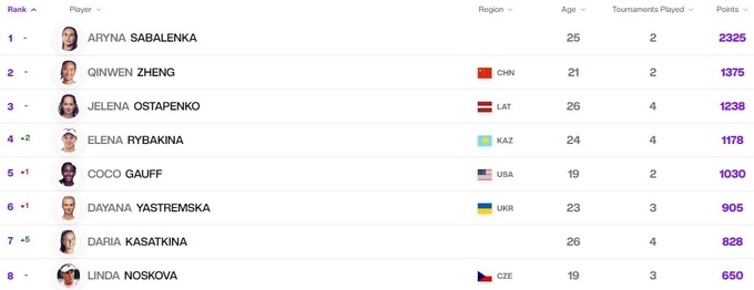 Чемпионка соревнований в ОАЭ Елена Рыбакина из Казахстана вернулась в топ-4 мирового рейтинга, подвинув американку Джессику Пегулу. Это единственное изменение в топ-10.