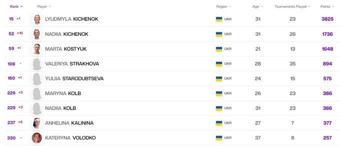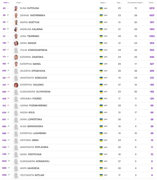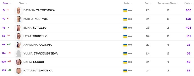 Элина Свитолина сохранила место в первой двадцатке, Даяна Ястремская поднялась на 3 строчки, Марта Костюк – на одну, Ангелина Калинина вернулась в топ-30, Леся Цуренко сохранила позицию. По одному месту потеряли Дарья Снигур и Юлия Стародубцева.