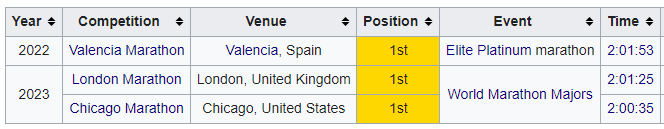 Ему принадлежит мировой рекорд в марафонском беге (2 часа 0 минут 35 секунд), установленный на Чикагском марафоне в 2023 году. Тренер кенийца Жерве Хакизимана также погиб в результате несчастного случая.