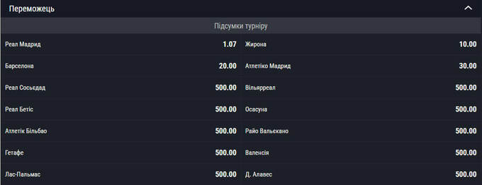 Перед 24-м туром чемпионата Испании на трофей жиронцев котировки составляли 6.50. Однако подопечные Мичела разгромно уступили прямому конкуренту за титул «Реалу» 0:4, поэтому коэффициент очень резко поднялся.