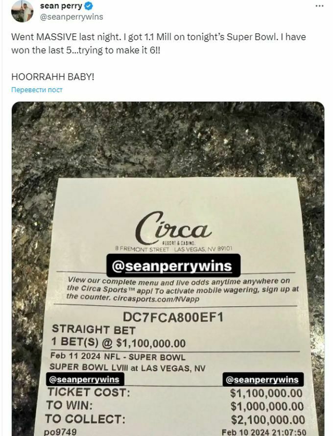 Перед началом матча Перри в соцсети X сообщил, что решил поставить солидную сумму именно на «Сан-Франциско». Если бы «Форти Найнерс» добыли победу, то выигрыш Шона составил бы 2,1 млн долларов.