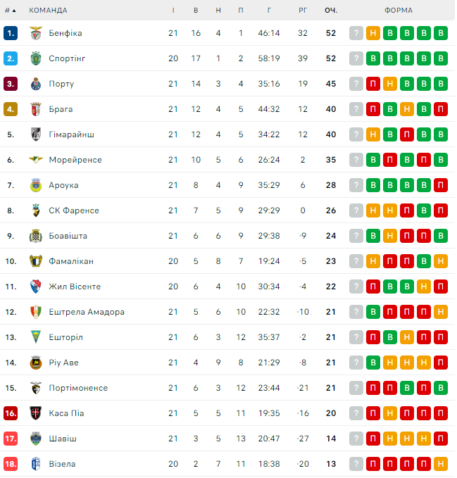Лидеры в Португалии: Бенфика и Спортинг (по 52), Порту (45), Брага и Витория Гимараеш (по 40).