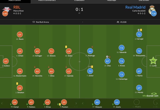 Оценки матча РБ Лейпциг – Реал Мадрид от WhoScored