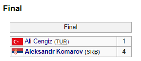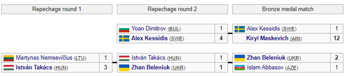 Это позволило Беленюку подняться на третью ступеньку пьедестала вместе с нейтральным атлетом Кириллом Маскевичем. Золото в этой категории выиграл Александр Комаров из Сербии, победивший в финале Али Ченгиза из Турции (4:1).