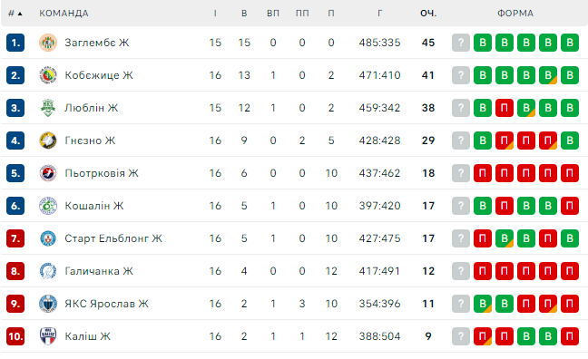 Галичанка занимает 8-е место среди 10 команд, имея 12 очков (4 победы и 12 поражений).