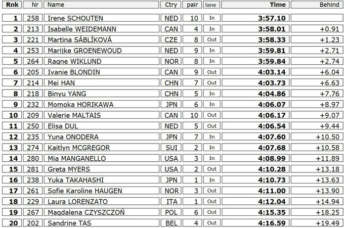 Для нидерландки этот титул чемпионки мира – первый на этой дистанции. Свою ближайшую соперницу, местную конькобежку Исабелль Вейдман Схаутен опередила почти на секунду. Замкнула призовую тройку шестикратная чемпионка мира Мартина Сабликова из Чехии.