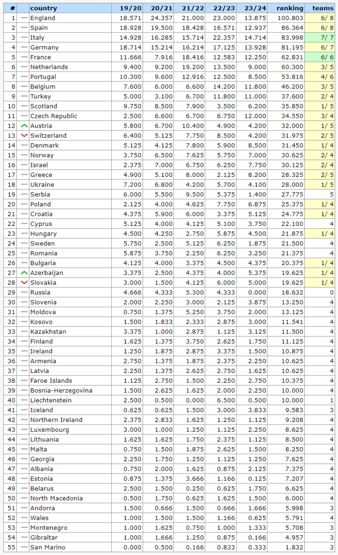 Таблица коэффициентов УЕФА 2024