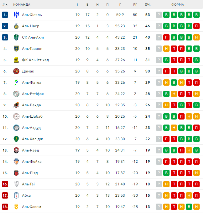 Лидеры: Аль-Хиляль (53), Аль-Наср (46), Аль-Ахли (40), Аль-Таавун (35), Аль-Иттихад (31).