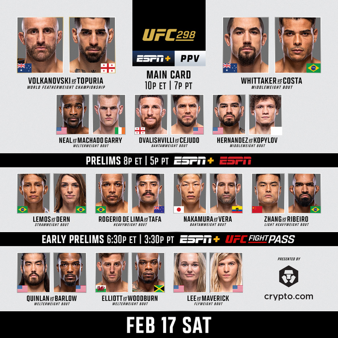 В ночь c 17 на 18 февраля в Анахайме (штат Калифорния) проходит турнир по смешанным единоборствам UFC 298.