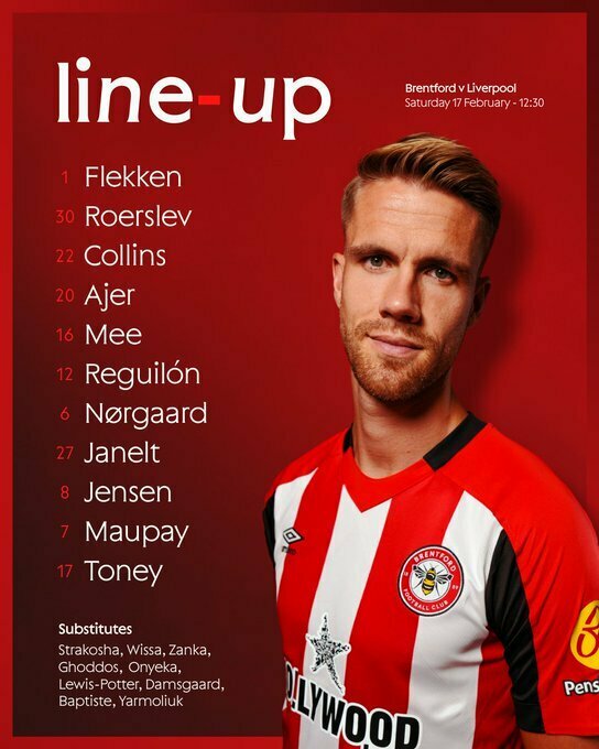 «Брентфорд»: Флеккен, Ми, Айер, Коллинс, Норгорд, Йенсен, Регилон, Янельт, Рёрслев, Мопе, Тоуни